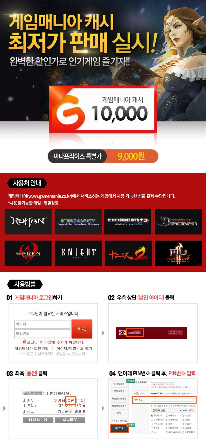 2. 게임매니아 결제창에서 PIN 충전 시 최대 20%의 추가충전 보너스 캐시를 받을 수 있습니다.