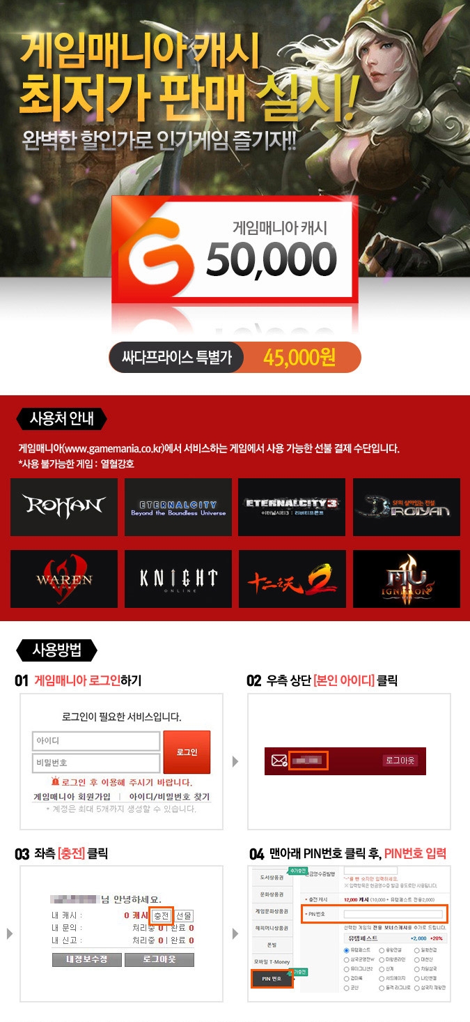 2. 게임매니아 결제창에서 PIN 충전 시 최대 20%의 추가충전 보너스 캐시를 받을 수 있습니다.